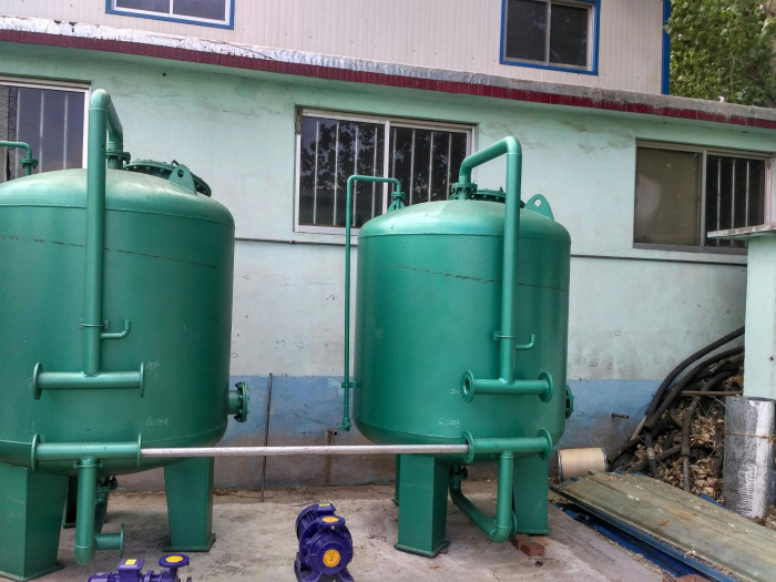 过滤器内填装除氟滤料活性氧化铝,除去水中氟。过滤器内填装海绵铁,除去水中氧。